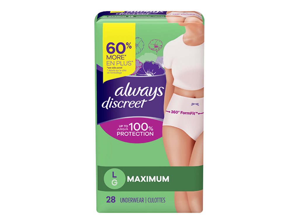Always Discreet Maximum Protection Incontinence Underwear in Large size provides up to 100% bladder leak protection with a discreet, comfortable fit. Designed for heavy leaks, it features an advanced absorbent core that locks in moisture and odors, keeping you dry and confident all day. The soft, flexible waistband and cotton-like material ensure a comfortable and secure fit under clothing. Suitable for both daytime and nighttime use. Each pack contains 28 underwear for long-lasting protection.