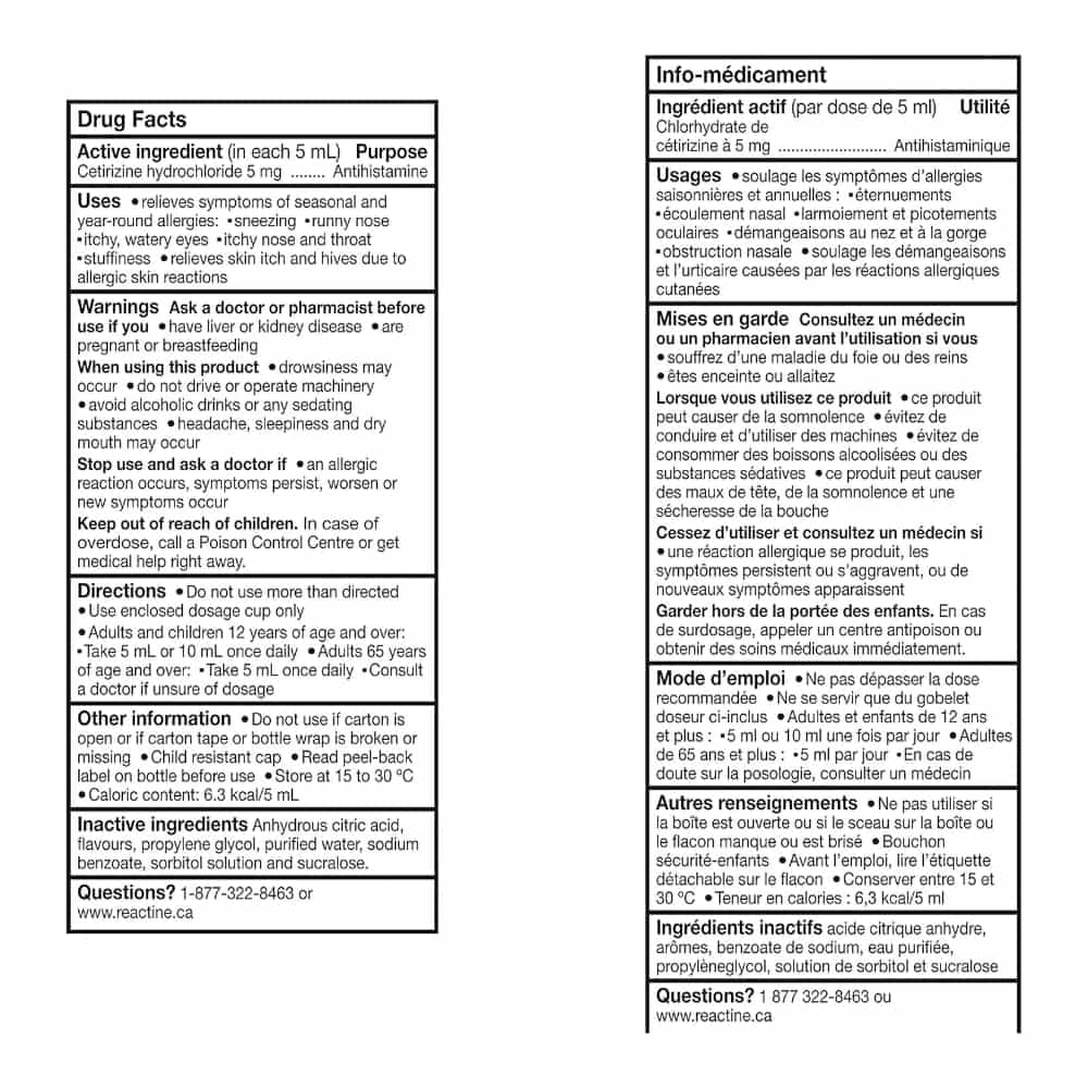 Reactine Allergy Liquid provides fast and effective relief from allergy symptoms such as sneezing, runny nose, itchy, watery eyes, and itchy throat. Formulated with Cetirizine Hydrochloride, it offers 24-hour non-drowsy relief. The pleasant white grape flavour makes it easy to take, providing a convenient option for both adults and children.