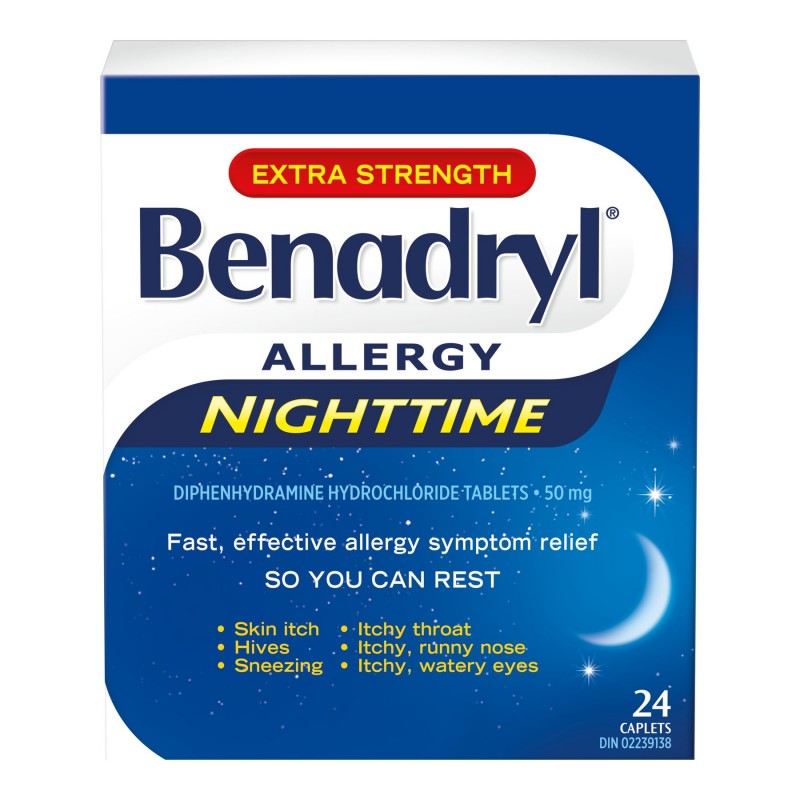Benadryl Allergy Extra Strength Nighttime Caplets (24 Count) is a high-potency antihistamine designed to quickly relieve severe allergy symptoms and help you get a better night's sleep. Formulated with an extra-strength dose of diphenhydramine, this product is ideal for those looking for effective allergy relief along with help getting a better night's sleep.