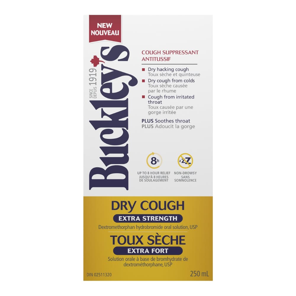 Buckley's Dry Cough Extra Strength Syrup is formulated to provide up to 8 hours of relief from dry, hacking coughs. This non-drowsy formula soothes irritated throats and suppresses coughs effectively. It is available in 250 mL bottles.