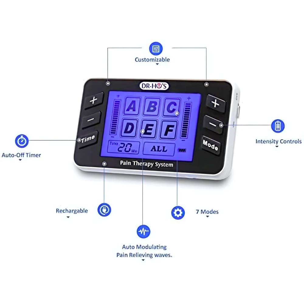 DR-HO'S Pro Pain Therapy System Ultimate Package is an advanced medical device designed to provide comprehensive pain relief to various areas of the body. This package combines TENS (Transcutaneous Electrical Nerve Stimulation), EMS (Electrical Muscle Stimulation) and patented AMP (Auto-Modulating Pulse) technology to deliver over 300 different types of stimulation, varying in length, pattern and frequency. It includes eight self-adhesive pads for wide coverage, six unique modes offering 24 different massage techniques and an adjustable 20, 30 or 40 minute timer, allowing treatment to be customized to individual needs. Additionally, the dual-port design facilitates simultaneous treatment of two areas at different intensity levels, optimizing therapy time. This package also incorporates foot pads, a back relief belt and a heating pad, expanding its functionality to address foot and back pain and provide heat therapy to improve circulation and reduce inflammation.