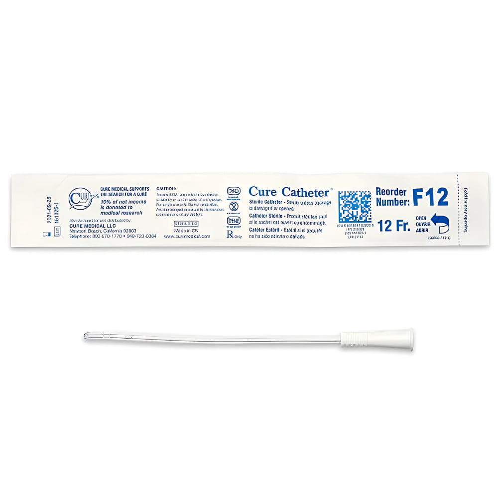 The Cure Medical® Male Straight Tip Intermittent Catheter is a sterile, single-use device designed for men requiring intermittent catheterization. Measuring 16 inches in length, it features polished, fire-polished eyelets to minimize friction and enhance comfort during insertion and removal. The catheter is uncoated, allowing users to apply their preferred lubrication as needed. Manufactured without DEHP, DINP, BPA, or natural rubber latex, it reduces the risk of allergic reactions and exposure to potentially harmful chemicals. The packaging includes unique dual openings, facilitating easier access and maintaining sterility during use. This catheter is available in various French sizes, ranging from 8 to 18, to accommodate individual needs.