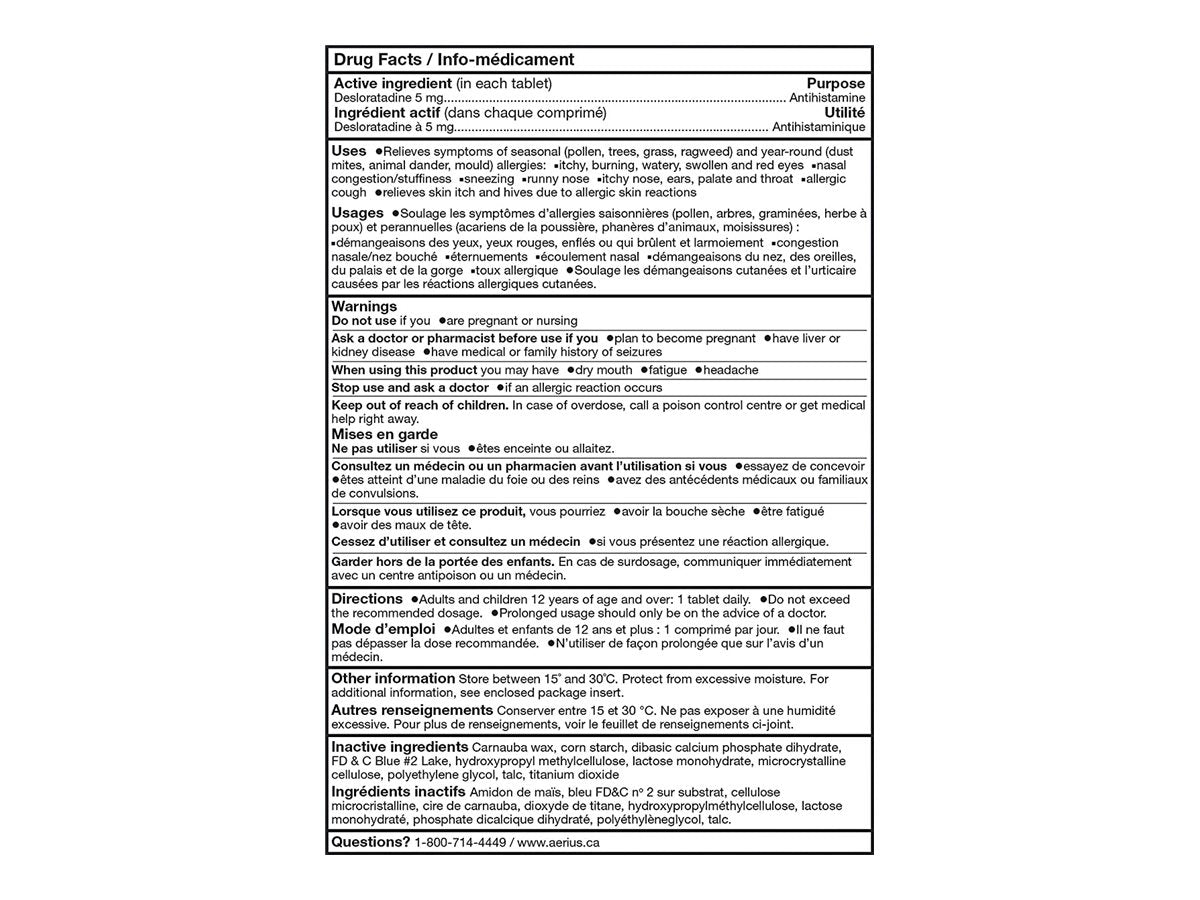 Aerius Allergy is a fast-acting antihistamine that provides 24-hour relief from allergy symptoms such as sneezing, runny nose, itchy eyes, and hives. Each tablet contains 5 mg of desloratadine, a non-drowsy formula designed to provide effective relief without causing sleepiness. The 30-tablet pack ensures long-lasting relief for allergy sufferers, making it perfect for daily use.