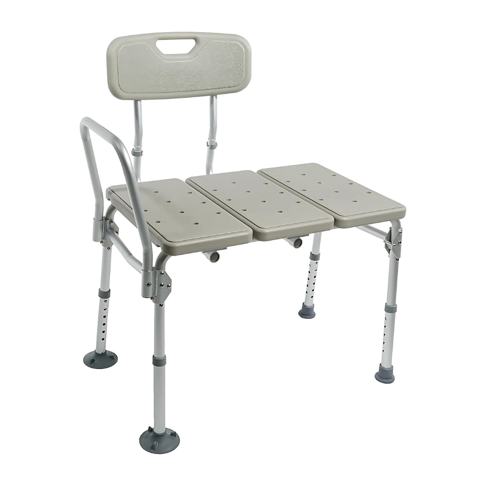 For bathing, the PCP 7392 Folding Transfer Bench makes it simple to transfer over the tub wall.It folds up small for easy storage and doesn't require any tools to assemble.Molded, long-lasting, non-slip seating that is simple to clean.Seat drainage holes increase safety.Grip your hand sideways for more support.Anodized aluminum frame that resists rust.Rubber tips that won't mar or slide.Easily lift with the handle on the backrest.The backrest can be easily flipped over to fit any tub.Overall seat height adjustment: 16" - 21"(40.3 - 53.3 cm)Seating area: 26"(66 cm) (W) x 16" (40.6 cm) (D)Seat dimensions: 29.5" x 20" (75 x 50.8 cm)Back height from seat: 13" (33 cm)Product weight: 9 lbs., 12 oz. (4.39 kg.)Weight capacity: 300 lbs. (136 kg.)