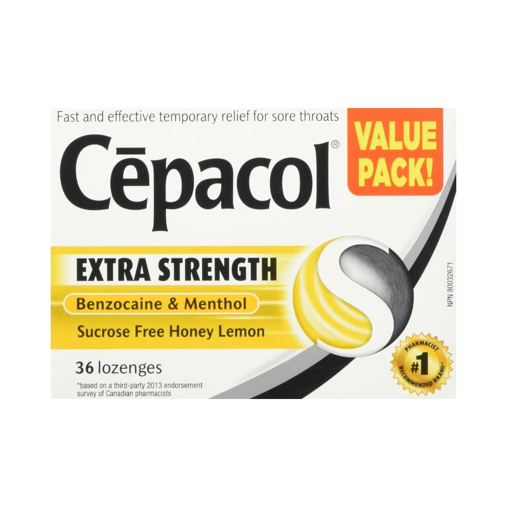 Cepacol® Extra Strength Sucrose Free Honey Lemon Value Pack, Sore Throat Lozenges, 36 ct is an over-the-counter medication designed to temporarily relieve sore throat pain. Each lozenge contains benzocaine as the active ingredient, which acts as a local anesthetic to numb and soothe pain quickly and effectively. These lozenges have a honey lemon flavor and are sucrose-free, making them suitable for individuals seeking sugar-free options. It is recommended to dissolve one lozenge slowly in the mouth every 2 hours as needed, not exceeding 10 lozenges in 24 hours. This product comes in a package of 36 lozenges.