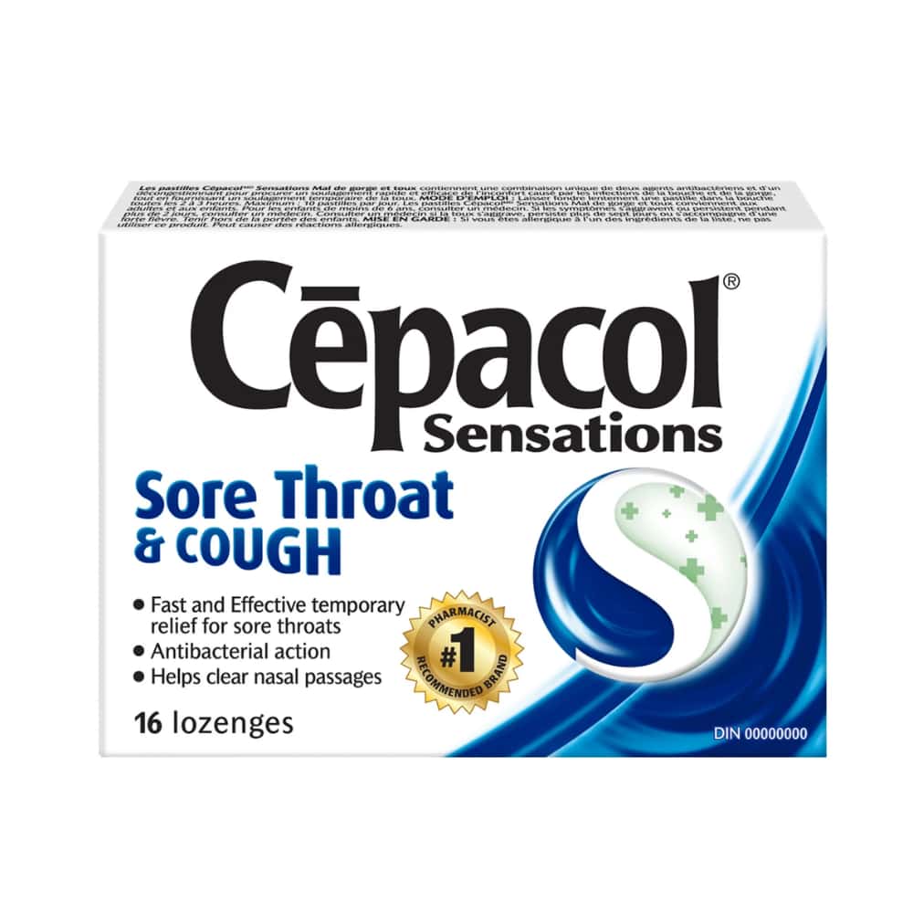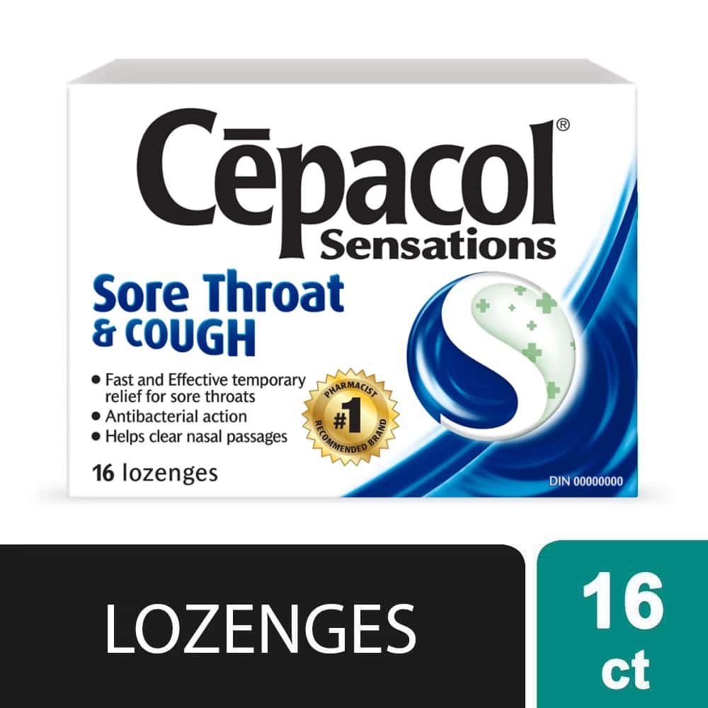 Cepacol® Sensations Sore Throat and Cough, Sore Throat Lozenges, 16 ct is an over-the-counter medication designed to temporarily relieve sore throat pain and cough. Each lozenge contains benzocaine, a local anesthetic that helps numb throat pain, and dextromethorphan, a cough suppressant that helps reduce the urge to cough. These lozenges have a mixed berry flavor and are formulated to provide rapid symptom relief. It is recommended to slowly dissolve one lozenge in the mouth every 4 hours as needed, not exceeding 6 lozenges in 24 hours. This product comes in a package of 16 lozenges.