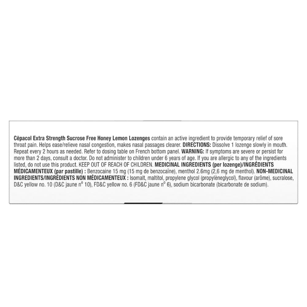 Cepacol Sensations Honey & Lemon - 36s is an over-the-counter medication designed to temporarily relieve sore throat and mouth irritation. Each lozenge contains two antibacterial agents: 2,4-dichlorobenzyl alcohol and amylmetacresol, which help combat mouth and throat infections. These lozenges have a honey and lemon flavor, making them pleasant to the taste. It is recommended to dissolve one lozenge slowly in the mouth every 2 hours as needed. This product is available in packs of 36 lozenges.