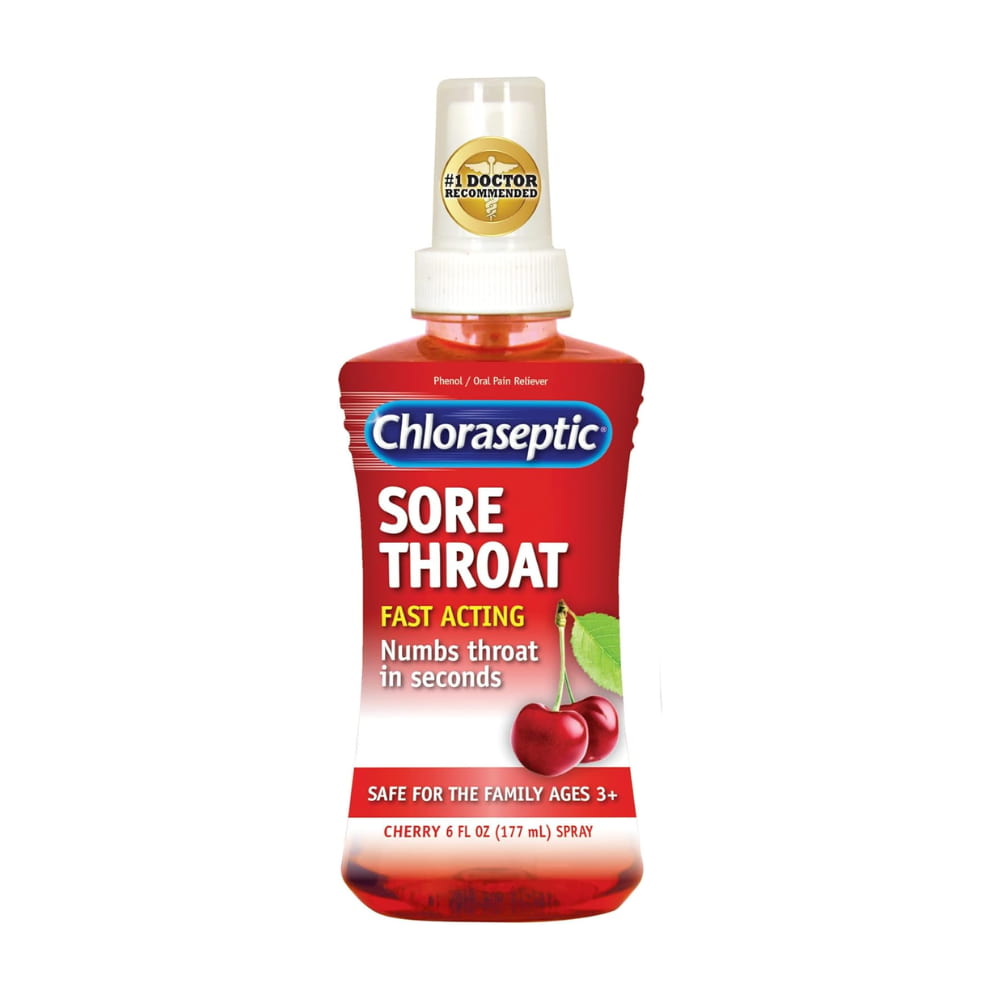 Chloraseptic® Sore Throat Spray in Cherry flavor is designed to provide fast-acting relief from sore throat and mouth pain. The active ingredient, phenol, acts as an oral anesthetic, temporarily relieving minor irritation, pain, sore mouth, and sore throat. This sugar-free and aspirin-free formula is suitable for adults and children aged 3 and older. The spray is designed to target the back of the throat directly, numbing throat irritations associated with cold and flu symptoms. It is available in a 6 fl oz (177 ml) bottle.
