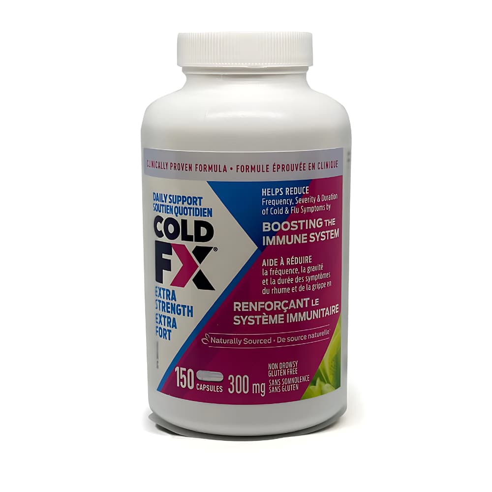COLD-FX® Extra Strength is a natural health product designed to help reduce the frequency, severity, and duration of cold and flu symptoms by boosting the immune system. Each capsule contains 300 mg of the active ingredient CVT-E002®, a proprietary extract derived from North American ginseng (Panax quinquefolius). This extra strength formulation provides 50% more of the active ingredient per capsule compared to COLD-FX® Daily Support.