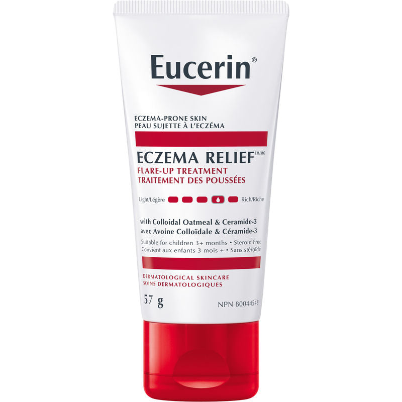 This Eucerin Eczema Relief Flare‑Up Treatment is a fragrance‑ and steroid‑free skin protectant cream formulated with 1% colloidal oatmeal, Ceramide‑3 and Licorice Root Extract (containing Licochalcone A) to instantly soothe and calm minor itching, irritation and dryness associated with eczema flare‑ups on face and body; it provides a mild cooling sensation, helps strengthen the skin’s moisture barrier, and is suitable for use by babies (over 3 months), children and adults for fast relief during acute episodes.