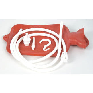 This fountain syringe holds up to 2 quarts (2000 cc) of water. It features molded red rubber construction with an embossed surface, and leak-proof seal. The syringe also includes tubing, fountain tips, and a shut-off clamp.