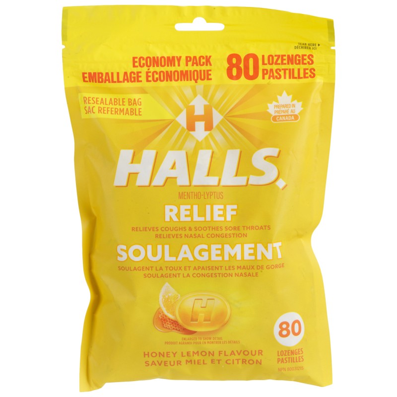 HALLS Relief Honey Lemon Cough Drops - 80's provide a balanced and effective solution for throat discomfort. Each drop contains 7.5 mg of menthol, delivering a soothing sensation that helps alleviate coughs and sore throats. The honey lemon flavor offers a pleasant taste, combining sweetness with a mild citrus note, making it enjoyable for users. The drops are individually wrapped, ensuring convenience and hygiene, and the resealable packaging allows for easy storage and accessibility. This product is suitable for individuals seeking reliable throat relief in a flavorful and practical form.