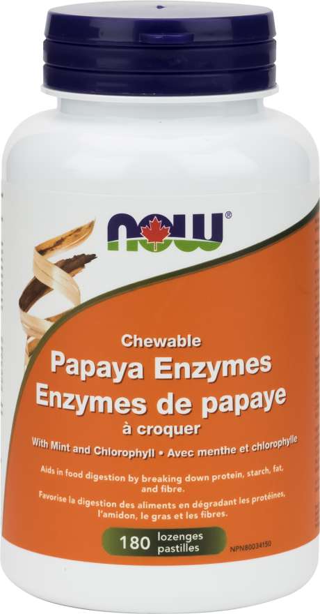 NOW: Papaya Enzymes Chewable Lozenges. PRODUCT DESCRIPTION Digestive enzymes to help digest proteins Aids in food digestion by breaking down protein, starch, fat, and fibre Chewable Digestive Enzyme Source of antioxidants that help protect against cell damage caused by free radicals. With Mint and Chlorophyll for fresh breath Vegetarian / Vegan Digestive enzymes are essential to the body's absorption and full use of food. The capacity of the body to make enzymes diminishes with age, and therefore the efficiency of digestion declines. NOW® Papaya Enzyme Lozenges have a refreshing taste and support digestion when taken after meals. Our tablets are made from whole, unripe, spray-dried Papaya powder, and contain 40 mg of Papaya per Lozenge. Bromelain has been extracted from pineapples to add further digestive help for protein and fats. Both papya and pineapple also provide a source of naturally-occuring antioxidants that can be protective in the digestive tract and body. In addition, Protease, Lipase and Cellulase have been included for a full spectrum of enzymatic activity to help digest protein, starch, fat and fibre. This lozenge may also be useful as a breath freshener. NPN 80071625 Adult Dosage: Chew or dissolve 2 lozenges 3 times daily in the mouth. Take with food/meals. For prolonged use, consult a health care practitioner. Each lozenge conatins: Papain (Carica papaya) (Fruit) 50 mg (100 FCC PU) Papaya (Carica papaya) (Whole) 40 mg Bromelain (Ananas comosus) (Fruit) 10 mg (360,000 FCC PU) Protease (Aspergillus oryzae) (Whole) 10 mg (50 FCC HUT) Lipase (Aspergillus niger) (Whole) 1 mg (10 USP LU) Cellulase (Aspergillus niger) (Whole) 0.31 mg (1.25 FCC CU) Alpha-Amylase (Aspergillus oryzae) (Whole) 1 mg (25 FCC DU) Non-Medicinal ingredients: Sorbitol, Mannitol, Stearic acid (vegetable source), Magnesium stearate (vegetable source), Silica, Peppermint Powder, Peppermint Oil and Sodium Copper Chlorophyllin. This lozenge may also be useful as a breath freshener.