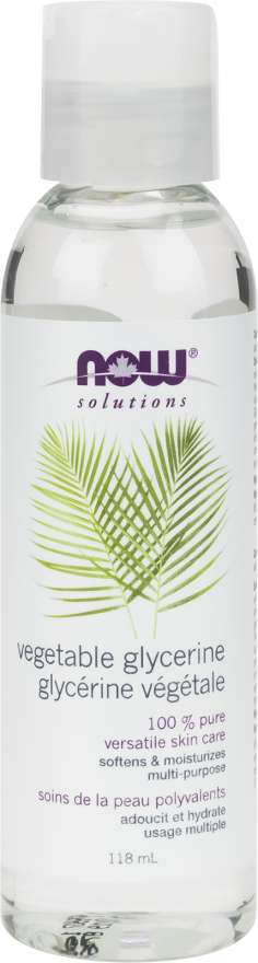 NOW: Vegetable Glycerine. PRODUCT DESCRIPTION Pure Versatile Skin Care Softens & Moisturizes Multi-Purpose Condition: Rough skin, simple cosmetic applications. Solution: Pure Vegetable Glycerine is an outstanding moisturizer and skin cleanser that also provides softening and lubricating benefits. It's hypoallergenic and easily soluble in water, making it suitable for use in all of your favourite cosmetic applications. Pure Vegetable Glycerine has a long shelf life and does not easily oxidize. It is a natural product derived from Non-GMO palm oil or vegetable oil. NOW® Solutions products are not tested on animals. Please recycle container. Clear bottle contains UV light protectant. NOW® Solutions is the next step in the evolution of personal care products. This comprehensive natural line encompasses anti-aging moisturizers and serums, bath and body gels, shampoos and conditioners, oral care, skin care, and essential oils, all of which are formulated with the finest functional ingredients from around the world. NOW® Solutions products avoid harsh chemicals and synthetic ingredients in all of our formulations, to provide a more naturally-sourced product line. For soft, luxurious skin simply massage a few drops of Pure Vegetable Glycerine on the desired area as needed. Discontinue use if redness or irritation occurs. 100% Pure Vegetable Glycerine.