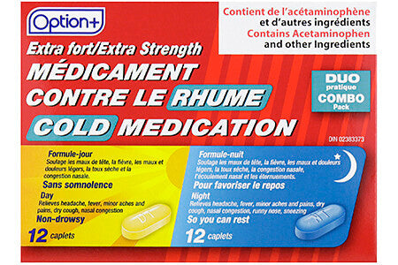Option+: Cold Day & Night 500 mg 12+12. Option+ Extra Strength Cold Medication. Day & Night 12+12 Caplets.