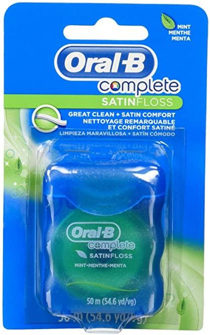 Oral B: Oral-B Complete SATIN floss. Oral-B Complete SATINfloss has a satin-like texture for comfortable flossing. - Releases a burst of mint freshness - Helps remove plaque and food particles between your teeth and just below the gumline