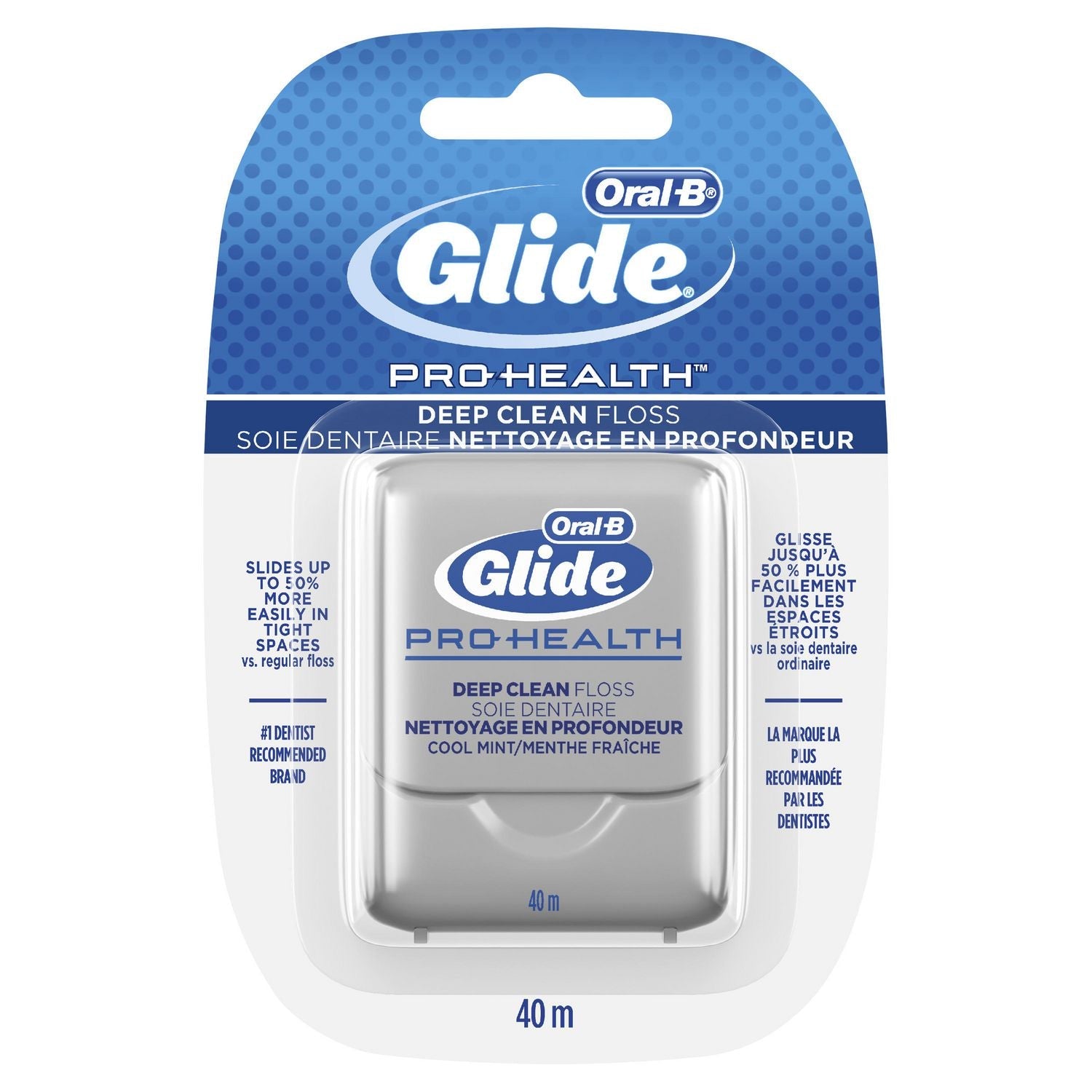 Oral B: Oral-B Glide Pro-Health Floss. Oral-B Glide Floss provides a more complete clean, and slides up to 50% more easily in tight spaces to help remove plaque and food particles between teeth and just below the gum line vs. brushing alone. - Silky smooth texture slides easily between teeth - Effectively removes tough plaque between teeth and just below the gum line - Provides a fresh, minty clean feeling every time you floss - Gently stimulates gums and helps prevent gingivitis as part of a complete dental plan - Contains a light coating of natural wax for improved grip
