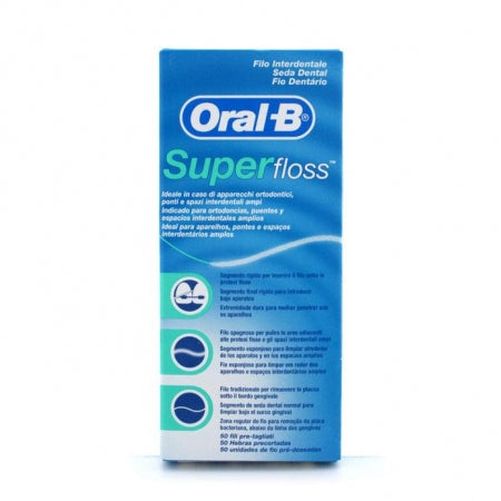 Oral B: Superfloss for Braces, Bridges and Wide Gaps. Oral-B Super Floss is ideal for braces, bridges and wide spaces between teeth. Its three unique components—a stiffened-end dental floss threader, spongy floss and regular floss to remove plaque—all work together for maximum benefits. Stiffened end to floss under appliances. Spongy-floss to clean around appliances and in wide spaces. Regular floss to help remove plaque under gumline. 100 pre-cut strands. Mint flavor 50 m floss Twin pack Directions: Bridges, Braces, Implants and Wide Spaces: Using the stiffened end, thread the spongy-floss between teeth and appliance or through wide spaces. Use a soft back-and-forth motion to remove bacterial plaque. Pull the spongy-floss through to the regular floss section. Gently slide the regular floss under the gumline. Use an up-and-down motion to help remove plaque. Regular Teeth: Gently slide regular floss between teeth and under the gumline. Clean under the gumline as directed above. Use a fresh section of floss for every tooth.