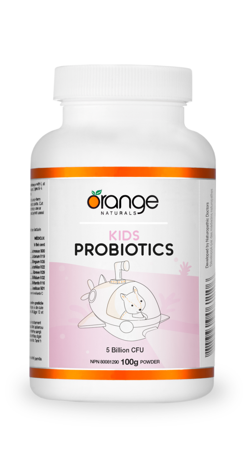 Orange: Kids Probiotics 5 Billion CFU 100g. Benefits Helps maintain a healthy balance of intestinal flora Supports a healthy intestinal tract Features Eight predominant probiotic species specially formulated for the growing needs of infants, children and adolescents Contains the three species kids need most: Bifidobacterium breve, Bifidobacterium infantis and Bifidobacterium longum Shelf stable and easy for travel as no refrigeration is needed Optimal levels of each species to foster healthy gut flora Powder for easy of use – just add to water, juice or smoothies