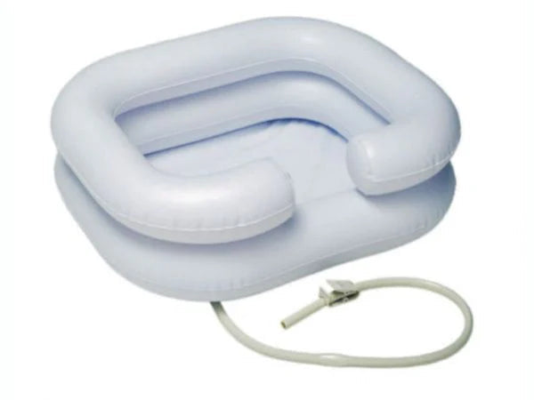 Parsons: Comfort Hair Wash Basin. Inflatable shampoo basin makes it possible to wash a person's hair without removing them from bed. The patient's neck and shoulders are cushioned in the inflatable rings. Handy for home or institutional use. Inflates by mouth or by air pump. Made of heavy duty vinyl. Complete with 4 ft (122 cm) drain hose, plug and instructions. Inflates to 28" (71cm) wide x 24" (61cm) long x 6" (15cm) deep.