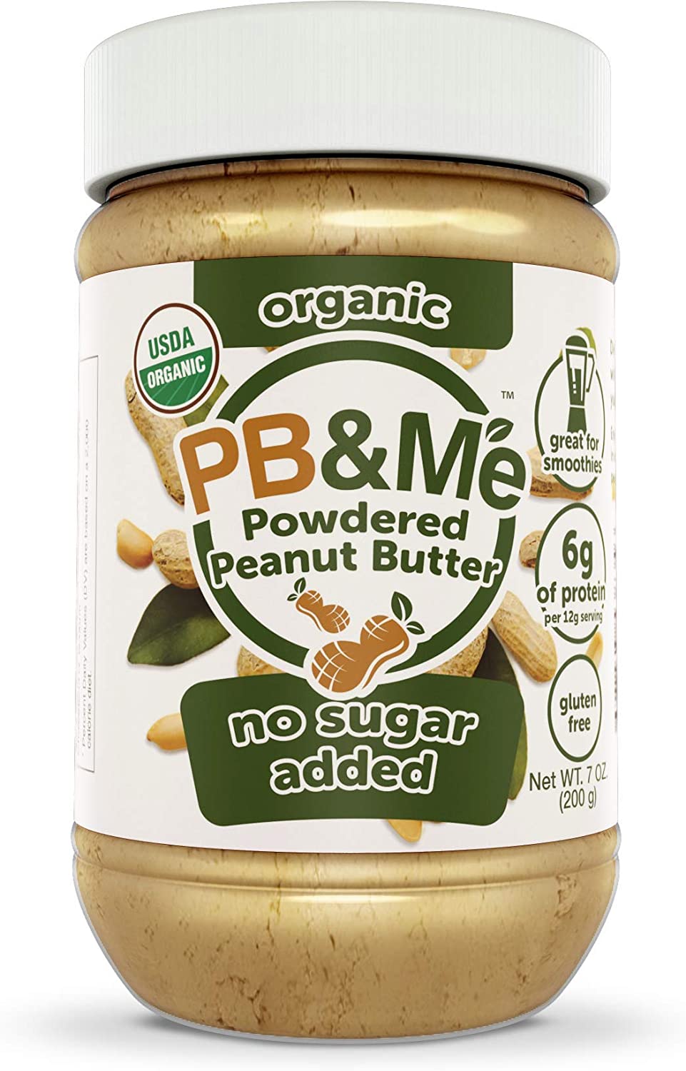 PB&Me: Powdered Peanut Butter (No Sugar Added). Organic Powdered Peanut Butter, made with delicious Non-GMO organic peanuts No Sugar Added! One single ingredient: organic peanuts A smoothie game changer: Not only delicious, but also loaded with 6 Grams of Protein per 12 Gram serving Low-calorie: We remove the oil, leaving behind a delicious peanut protein with only 45 calories per serving Vegan, Non-GMO, Gluten Free and great for baking!
