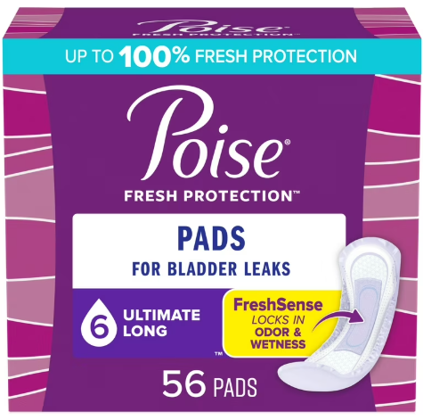 Poise Ultimate Incontinence Pads (Long, 56‑count) offer 6‑drop ultimate absorbency, specifically engineered to combat bladder leaks with confidence. These pads feature an Absorb‑Loc core that locks away wetness and neutralizes odor for up to 12 hours, while the ContourFit shape and leak‑block sides keep you comfortably dry. Crafted with a Dry‑Touch surface, they’re 10× drier than leading period pads for unmatched comfort and freshness.