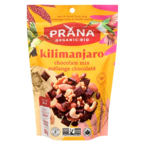 Prana: Kilimanjaro Deluxe Chocolate Trail Mix. Grab a handful for a wholesome snack during your outdoor activities or add it to your lunch box for a tasty boost of energy. Kilimanjaro’s synergy of ingredients allows you to indulge responsibly, without an ounce of guilt! The perfect snack for chocolate lovers. You can also use this mix to take your baked goods to a whole new level! Ingredients: 70% Cocoa Dark Chocolate* (Chocolate liquor*, Cane sugar*, Cocoa butter*, Soy lecithin*, Vanilla extract*), Cashews*, Raisins*, Almonds*, Cranberries* (cranberries*, Cane juice*, Sunflower oil*), Walnuts*, sea salt. *Organic