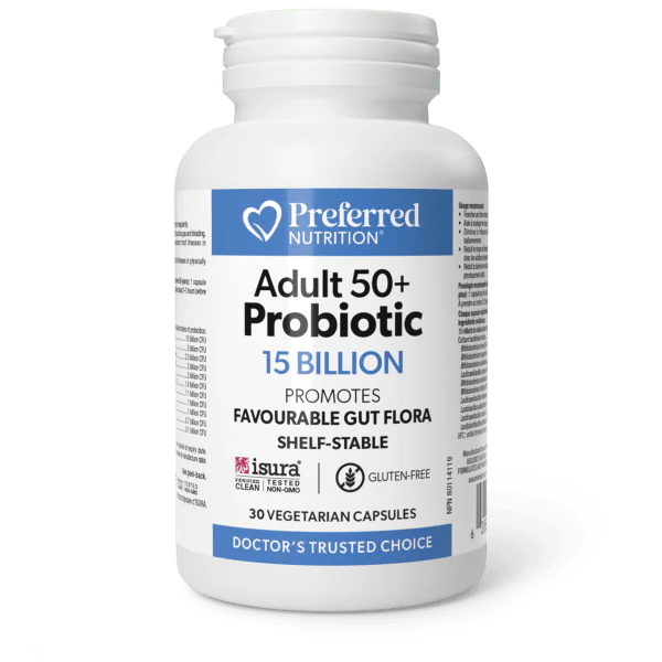Preferred Nutrition: Adults 50+ Probiotic 15 Billion Capsule. Preferred Nutrition Adult 50+ Probiotic features 15 billion active cells from 10 strains to promote favourable gut flora in older adults. These one-per-day vegetarian capsules deliver clinically studied bifidobacteria and lactobacilli to help provide gentle relief of constipation and reduce the duration of upper respiratory tract illness in physically active adults. Helps provide gentle relief for constipation and irregularity Promotes a favourable gut flora Helps support intestinal and gastrointestinal health Supports digestion by reducing transit time Reduces the risk of developing and the duration of upper respiratory tract illness in physically active adults Contains clinically studied bifidobacteria and lactobacilli