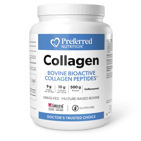 Preferred Nutrition: Collagen Powder. Preferred Nutrition Collagen features high-quality, grass-fed, pasture-raised bovine collagen peptides. Each daily scoop provides 10 g of absorbable, hydrolyzed collagen and 9 g of protein. This flavourless and odourless powder mixes easily into hot and cold beverages to actively support beautiful skin from the inside out. Provides 10 g of collagen peptides and 9 g of protein per scoop Contains high-quality, hydrolyzed collagen for easy absorption Made from grass-fed, pasture-raised bovine collagen Flavourless and odourless powder