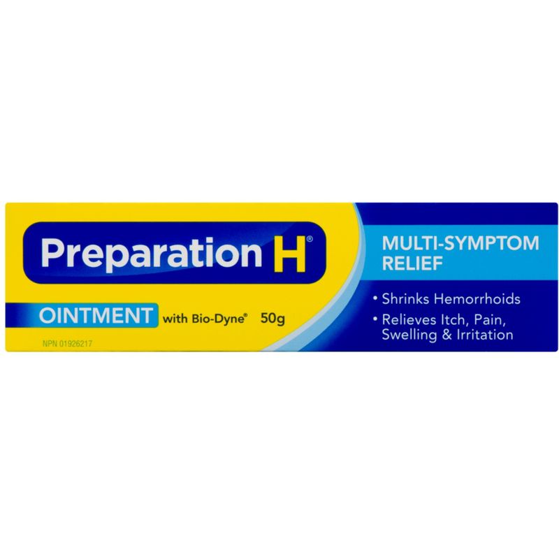 Preparation H® Multi‑Symptom Hemorrhoid Treatment Ointment with Bio‑Dyne 50g Tube is a specially formulated hemorrhoid ointment that targets internal and external symptoms by shrinking swollen hemorrhoidal tissue and soothing irritation, itching, pain, and swelling. It features Bio‑Dyne—a yeast‑derived live cell derivative retained in the Canadian/European formulation—for skin‑healing and anti‑wrinkle benefits, combined with phenylephrine for vasoconstriction and ingredients like petrolatum to lubricate and protect the affected area.