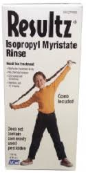 Resultz: Lice Treatement. Resultz Isopropyl Myristate Rinse Head Lice Treatment is safe and convenient for the entire family since it is odourless and colourless and leaves no chemical residue. This treatment is ideal since it works in just 10 minutes to quickly get rid of lice and nits so that you can get back to your schedule fast. This kit comes with the application and a comb to ensure that all members of your family are lice free. This treatment works by dissolving the wax that covers the louse’s outer skeleton, which dehydrates and kills the parasite. Isopropyl myristate 50% is clinically proven to be effective for treating head lice. Isopropyl myristate, the active ingredient of Resultz™, is widely used in lower concentrations in skincare and cosmetic products such as lipstick, bath oil, and moisturizers. As a head lice treatment, isopropyl myristate 50% is colourless and odourless. It can be used for people aged 4 years and older.