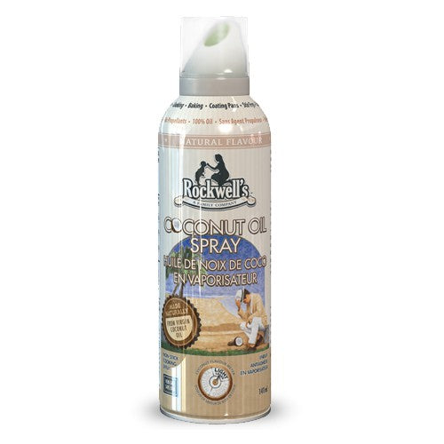 Rockwell's: Coconut Oil Spray. Rockwell's Coconut Oil Spray is a user friendly, premium cooking oil made naturally from fresh, virgin coconut oil. Use in place of other oils for cooking, baking or frying/stir frying up to 350°F/176°C. Works well as a non-stick coating for pans. Tastes great on vegetables, salads and popcorn. Smooth, delicious, light coconut flavour.