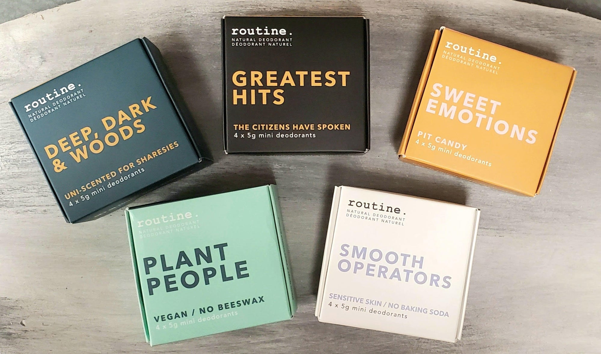 Routine: Deodorant Minis Kits. Like with music, we all have different tastes, styles + moods when it comes to scent. The effectiveness of your deodorant has a whole LOT to do with how it mingles with your own personal musk, pheromones and hormones which are fluid and ever evolving. That’s why Routine believes options are a NECESSITY when it comes to your deodorant. Routine curated these kits to help you find your scent soulmate(s). Have some fun, mix them together find a signature scent as unique and beautiful as you are! Kits: Smooth Operators (Sensitive Skin-Baking Soda Free): Sexy Sadie, Blackberry Betty, The Curator, Johnny's Cash Deep, Dark & Woods (Uni-Scented For Sharesies): Like a Boss, Superstar, Johnny's Cash, Reuben and the Dark & Stormy Sweet Emotions ("Pit Candy"): Sweet Jane, Blackberry Betty, Maggie's Citrus Farm, Bonita Applebom Plant People (Vegan/No Beeswax): Sexy Sadie, Cat Lady, Johnny's Cash, Lucy in the Sky Greatest Hits: Like a Boss, Superstar, The Curator, Sexy Sadie