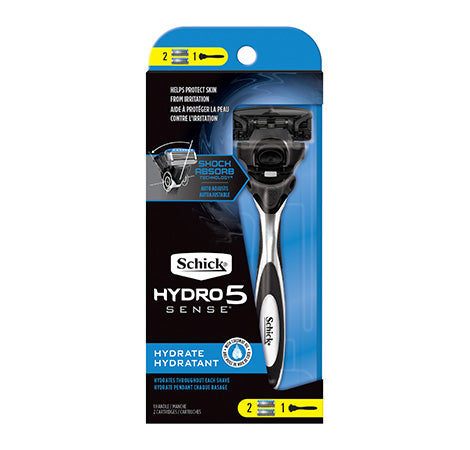 Schick®: Hydro 5 Sense® Hydrate Razor. The NEW Schick® Hydro 5 Sense® Razor handle features Shock Absorb™ technology, which auto-adjusts on contact with your skin. It's the only razor with technology customized for your skin and how you shave. Pair with our Hydro Sense® Hydrate Refill Cartridges which contain a uniquely designed gel with Coconut Oil and also hydrate your skin throughout each shave. The Schick® Hydro 5 Sense® Razor handle has Shock Absorb™ technology that auto-adjusts to pressure applied to your skin while shaving. The unique technology backs off when too much pressure is applied and adds pressure when needed, letting you customize the balance of contact and pressure for your skin, helping to reduce irritation. Optional Lock Button allows you to disable the shock absorbing feature. 7 Hydrating Gel Pools The 7 Hydrating Gel Pools are designed to provide instant lubricating protection and hydrate throughout each shave. Flip Trimmer for Hard-to-Reach Areas The Flip Trimmer on Schick® Hydro 5 Sense® makes it easy to trim those hard-to-reach areas. Conveniently switch between shaving and trimming with a simple flip of the thumb. Shock Absorb Technology The unique Shock Absorb technology auto-adjusts based on how you shave, backing off if you're applying too much pressure, or adding back when you need it.