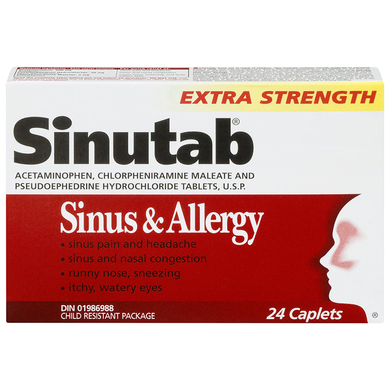Sinutab: Sinus & Allergy Extra Strength. Sinutab Sinus & Allergy Extra Strength temporarily relieves nasty symptoms related with sinus infections and allergic reactions. Symptom Relief: Sinus pain and headache Sinus and nasal congestion Runny nose, sneezing Itchy, watery eyes Dosage: Adult use only (12 years and older): 1-2 caplets every 4-6 hours. Do not exceed 8 caplets per day. Medicinal Ingredients (per caplet): Acetaminophen (analgesic) ... 500 mg Pseudoephedrine hydrochloride (nasal decongestant) ... 30 mg Chlorpheniramine Maleate (antihistamine) ... 2 mg Non-medicinal Ingredients: cellulose, croscarmellose sodium, FD&C Yellow No. 10, FD&C Yellow No. 6, hypromellose, polyethylene glycol, polysorbate starch, titanium dioxide, wax, zinc stearate.
