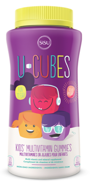 Sisu: U-Cubes Kids Multivitamin Gummies. 120 | Gummies Great-tasting Sisu U-Cubes™ gummies provide the important vitamins and minerals children need, in a chewy daily formula specially designed for their growing bodies and minds. With kid-friendly flavours of grape, cherry and orange in each bottle, these pectin-based gummies contain no animal gelatin, high-fructose corn syrup or artificial flavours, sweeteners and colours. Benefits Chewy multivitamin treats kids will love Pectin-based gummies, no animal gelatin No artificial flavours, sweeteners, or colours Medicinal ingredients Vitamin A (vitamin A palmitate) 113 mcg RAE(375 IU) D-pantothenic acid (calcium D-pantothenate) 1.25 mg Vitamin B6 (pyridoxine hydrochloride) 0.25 mg Vitamin B12 (cyanocobalamin) 0.6 mcg Folic acid (folate) 25 mcg Vitamin C (ascorbic acid) 7.5 mg Vitamin D3 (vitamin D, cholecalciferol) 3.75 mcg (150 IU) Vitamin E (d-alpha tocopheryl acid succinate) 2.35 mg AT (3.5 IU) Iodine (potassium iodide) 15 mcg Zinc (zinc citrate) 1 mg Non-medicinal ingredients Dicalcium phosphate, tricalcium phosphate, magnesium citrate, maltodextrin, inositol, silicon dioxide, D-mannitol, sugarcane juice, tapioca syrup, purified water, pectin, citric acid, maqui berry, black carrot juice, turmeric, natural grape flavour, natural cherry flavour, natural orange flavour Dosage Children (2-8 years): Chew 2 gummies 1 time per day; Children (9-13 years): Chew 4 gummies 1 time per day. Take with food. Take a few hours before or after taking other medications Contains no Dairy, wheat, gluten, artificial colours, artificial flavours, or artificial preservatives