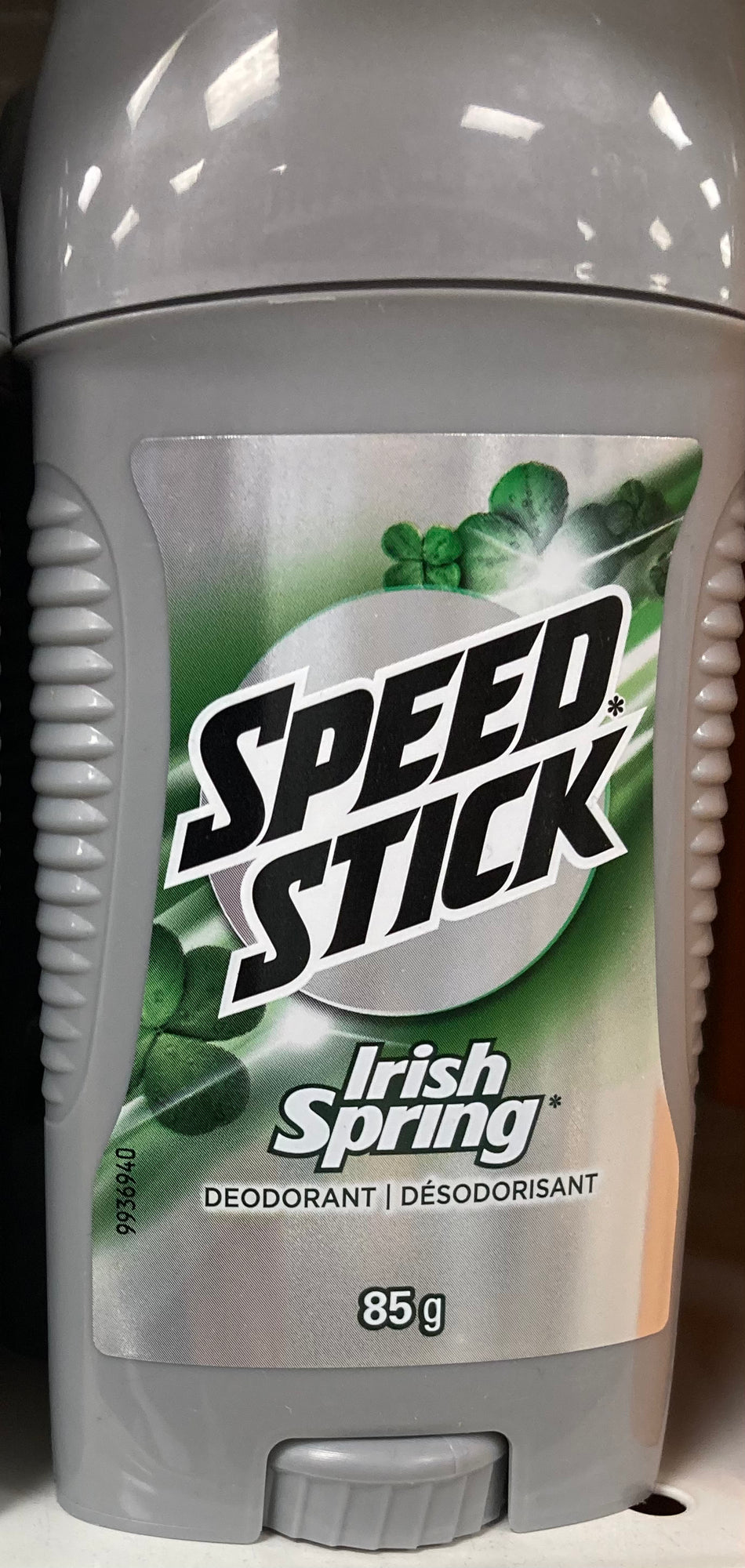 Speed Stick: Irish Spring Deodorant. A legendary combination of Speed Stick odour protection and the fresh, clean scent of Irish Spring. Scent: Original