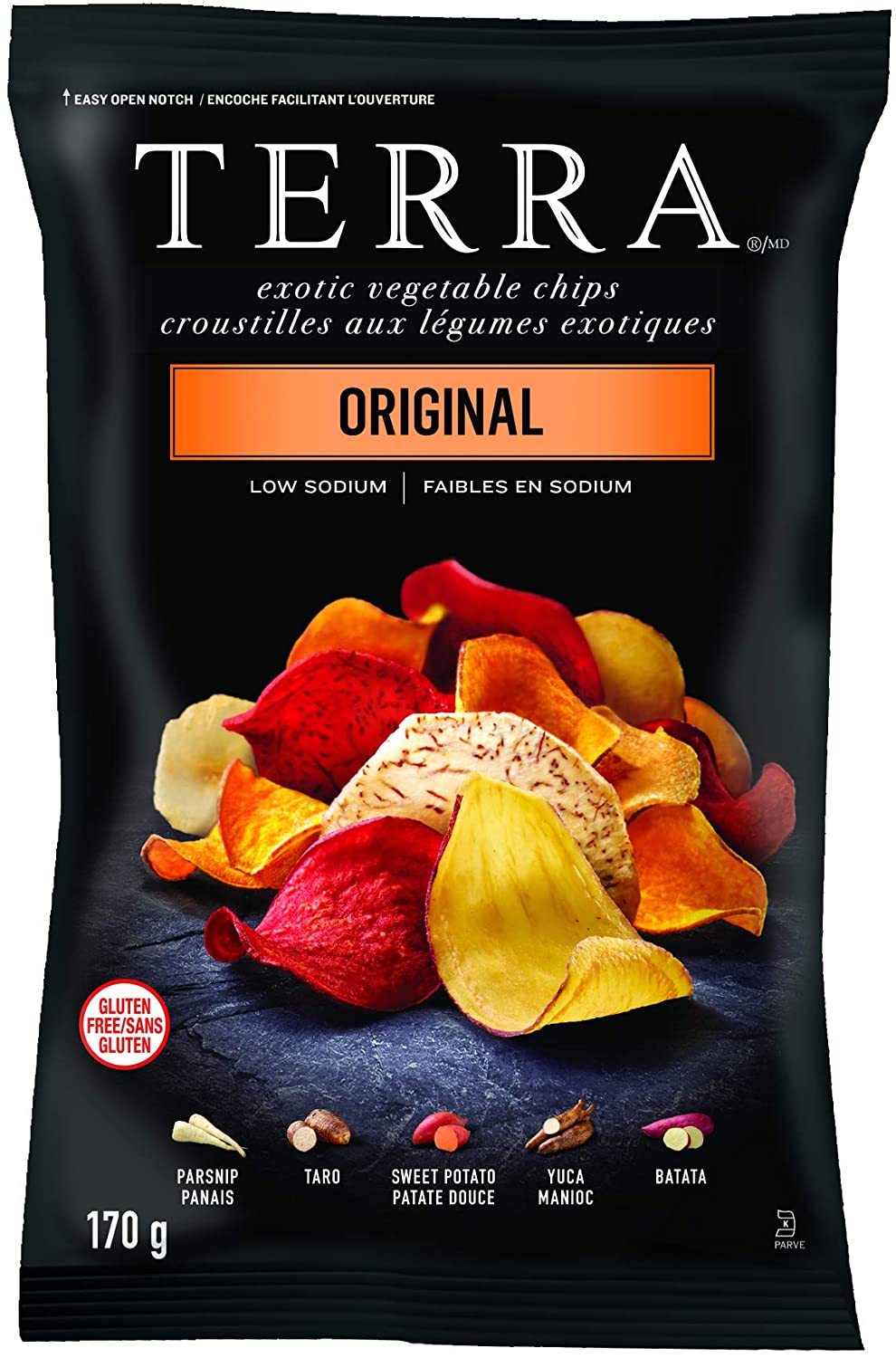 Terra: Original Vegetable Chips low sodium. Taking these old-fashioned root vegetables and make them uniquely new by preparing them in a way rarely done prior, into a naturally colorful collection of chips. This delicious variety of vegetables is savory, sweet, and it always achieves a satisfying balance of flavors that is complex, nutty, rich, and delicate.