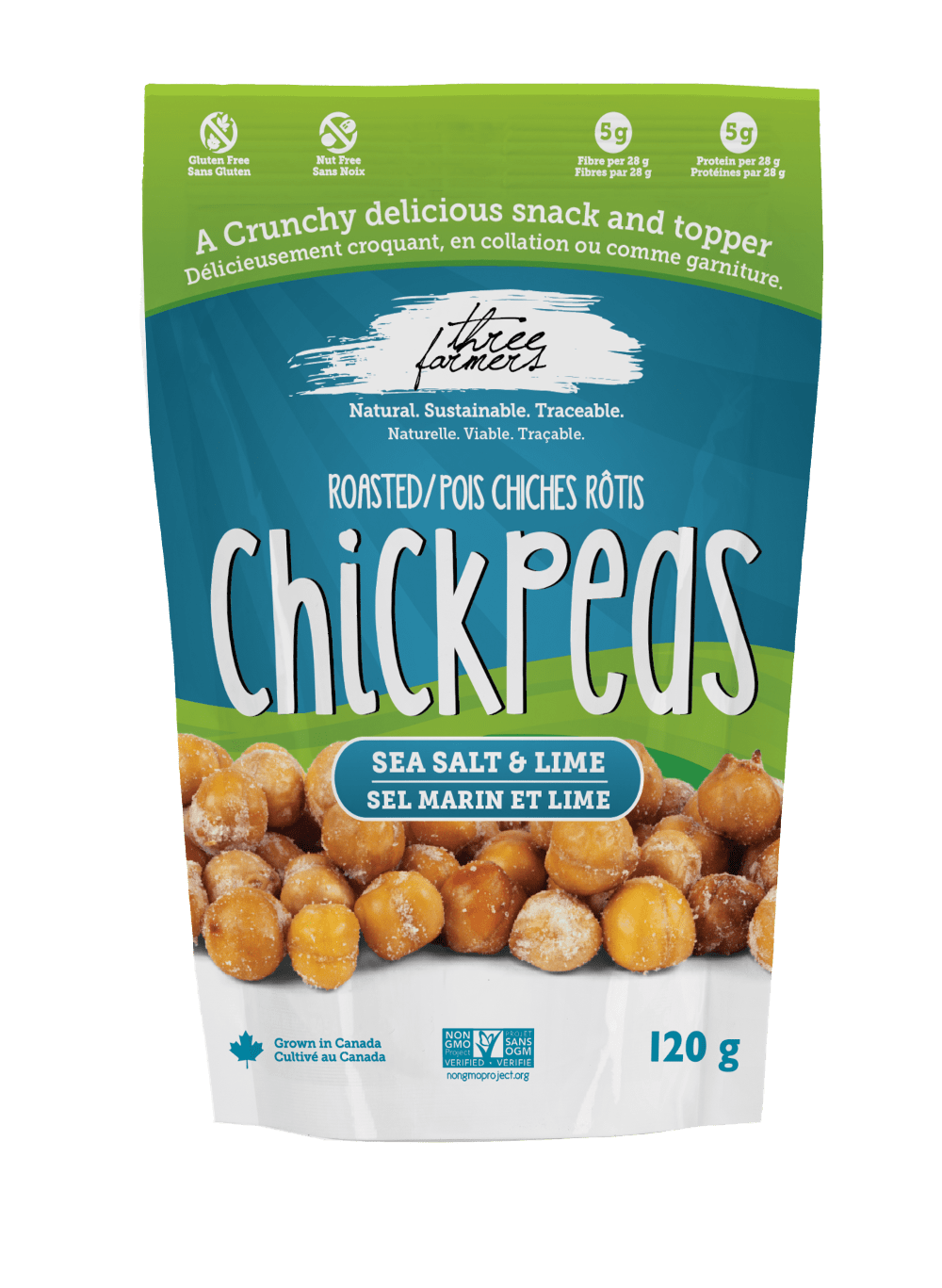Three Farmers Roasted Chickpeas. THE PERFECT SNACK AND SALAD TOPPER With an impressive nutritional profile and a satisfying airy crunch, the Three Farmers Roasted Chickpeas are both good for you and delicious. This product is grown and made in Canada and just like our camelina oil, traceable back to the farm where the chickpeas were grown! Three Farmers Roasted Chickpeas are an excellent nut free and gluten free alternative to traditional snacks or salad toppers. Use them in place of nuts, chips, or croutons for a healthy snack on the go or at home and enjoy their full flavor! Send them in your kids lunch bags as the perfect snack!