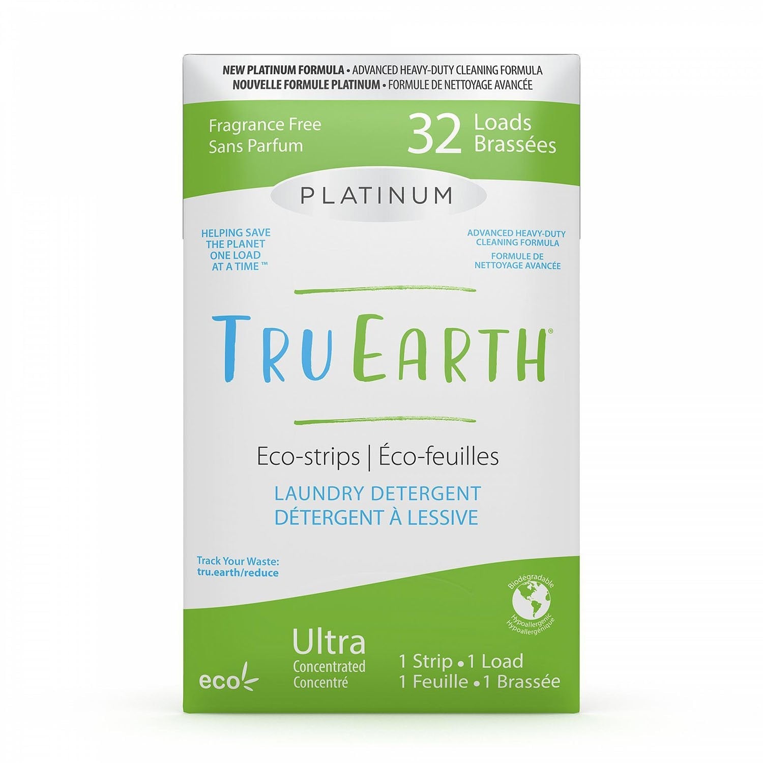 Truearth: Laundry Detergent Platinum Eco-Strips. Each Platinum Tru Earth eco-strip packs ultra-concentrated, convenient, eco-friendly cleaning power into a tiny, pre-measured strip of laundry detergent that you just toss in the wash. The new advanced platinum formula has heavy duty cleaning power for the dirtiest clothes. New Platinum Heavy Duty Laundry Detergent Formula designed to fight the dirtiest clothes Perfect for stinky workout gear New zero-waste compostable packaging No measuring & no mess Dissolves completely in Hot or Cold Water. Works in all washing machines, including HE. Front loads or top loads. Helps keep 700,000,000 plastic jugs out of landfills per year Tru Earth Certifications Paraben-free Phosphate-free Hypoallergenic Readily biodegradable in accordance with OECD 310D Vegan: no animal-based ingredients or testing on animals by us or our ingredient suppliers