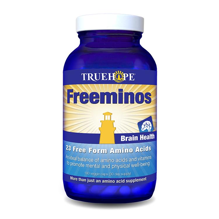 Truehope: Freeminos - Free-Form Amino Acids. Freeminos is a free-form amino acid supplement: meaning it can be used by the body right away, without having to be completely digested first. And since amino acid supplements require vitamins to work properly, they are included in this Truehope formulation. This Truehope formula contains more essential amino acids per serving than most brands - including 50% more BCAAs (branched chain amino acids - leucine, isoleucine and valine), and nearly double the amount of glutamine and glutamic acid, which help with mental and physical stress. L-Theanine has also been added, to help promote relaxation. Amino acids not only transport and store nutrients all over the body, they're also the fundamental elements which compose the hormones and neurotransmitters which govern our mental processes and moods. If our diet is deficient in bioavailable amino acids or we're undergoing too much physical activity or mental stress, our bodies have to break down its own tissues such as muscle mass to carry out those vital functions -- unless we take a supplement. Video Transcription - Truehope AminoPower Dietary Supplement In this wonderful world of ours, everything is built block upon block, layer by layer, and our bodies are no different. Amino acids in their natural state form the basis for life. They are the metabolic building blocks of the body. Amino acids are the essential raw materials your body needs to produce cells, bones, hormones, hair, skin, and more. Without a regular supply of high-quality bioavailable amino acids, the body must break down its tissues such as muscle to sustain vital functions. However, the tremendous job of the amino acid does not stop there. Amino acids are also crucial components of hormones and neurotransmitters needed for physical and mental health. Truehope's AminoPower Advanced is an extremely bioavailable blend of seven vitamins and 23 amino acids including all the branched chain and essential amino acids. AminoPower Advanced is a free-form amino acid supplement which means it does not need to be digested before it can enter the body. Our ingredients - based on mother's breast milk - are easily absorbed and nourish the body quickly, making Truhope AminoPower Advanced one of the most bioavailable products of its kind. Naming Note: A similar formula was previously marketed in Canada as Truehope Amino Power Plus. The name Amino Power Advanced is also used in the United States. Freeminos Ingredients: Amount per 3 capsule serving: Vitamin C (L-ascorbic acid): 225 mg Vitamin D (cholecalciferol): 7.5 mcg Vitamin E (d-alpha tocopheryl succinate): 10.05 mg Thiamin (thiamin mononitrate): 0.12 mg Vitamin B6 (as pyridoxine 5-phosphate): 2.25 mg Folic acid: 75 mcg Vitamin B12 (methylcobalamin): 18 mcg Alanine (as L-alanine): 52.2 mg Arginine (as L-arginine): 66.6 mg Aspartic acid (as L-aspartic acid): 122.4 mg Carnitine (as L-carnitine L-tartrate): 90 mg Citrulline (as citrulline): 5.4 mg Cysteine (as N-acetyl-L-cysteine): 23.4 mg Glutamic acid (as L-glutamic acid): 145.5 mg Glutamine (as L-glutamine): 126 mg Glycine (as L-glycine): 36 mg Histidine (as L-histidine): 48.6 mg Isoleucine (as L-isoleucine): 111.9 mg Leucine (as L-leucine): 180 mg Lysine (as L-lysine): 133.5 mg Methionine (as L-methionine): 27 mg Phenylalanine (as L-phenylalanine): 72 mg Proline (as L-proline): 104.4 mg Serine (as L-serine): 66.6 mg Taurine (as L-taurine): 72 mg Theanine (as L-theanine): 99.9 mg Threonine (as L-threonine): 102.9 mg Tryptophan (as L-tryptophan): 63 mg Tyrosine (as L-tyrosine): 52.2 mg Valine (as L-valine): 99 mg Other ingredients: methylcellulose (veggie capsule), cellulose, silicon dioxide, magnesium stearate, natural vanilla flavour. Suggested Usage: Freeminos can be used anytime as a daily amino acid supplement (which can help build lean muscle during exercise, or help reduce cognitive fatigue during stressful situations), or as part of the process of transitioning off psychiatric medications. Take 3 capsules twice daily with food, or between meals. Store in a cool, dry place, or refrigerate. Warnings: Consult a healthcare practitioner prior to using Truehope Freeminos if you are pregnant or breastfeeding. Ensure adequate hydration before, during and after exercising.