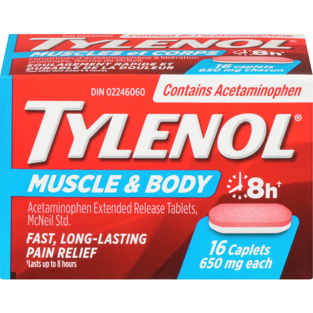 Tylenol: Muscle & Body 8 Hours. When your muscles are aching or your body is in pain, you want relief fast but you also want it to last so you can GET BACK TO NORMAL, WHATEVER YOUR NORMAL IS® Now try TYLENOL® Muscle Aches & Body Pain. TYLENOL® Muscle Aches & Body Pain caplets work in two ways. The first layer dissolves quickly to relieve pain fast. The second layer is time-released to provide extended relief that lasts throughout the work day.* *Up to 8 hours of relief. For effective relief of: muscle aches body pain joint pain pain due to inflammation Format: Bi-layer extended release caplets Medicinal ingredient (each caplet contains) Purpose Acetaminophen 650 mg Pain reliever Non-medicinal ingredients: Carnauba wax, cellulose, corn starch, FD&C red no. 40, hydroxyethyl cellulose, hypromellose, magnesium stearate, microcrystalline cellulose, povidone, sodium starch glycolate, triacetin.