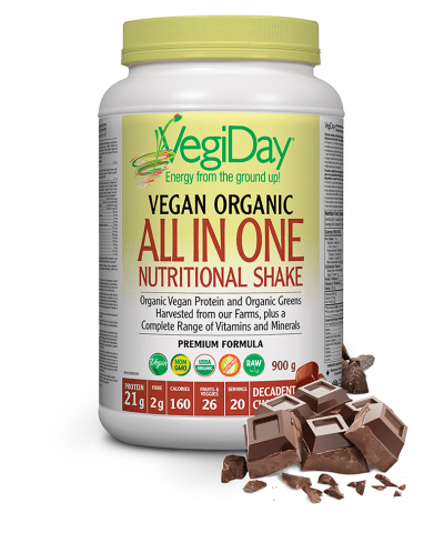 VegiDay: Vegan Organic All In One Nutritional Shake. Everything You Need in One Delicious Scoop Provides 21 g of complete raw vegan protein per serving • A delicious and convenient boost of plant-based nutrition • Features a complete range of vitamins and minerals to support energy production and healthy immunity • Contains organic superfoods and greens harvested from our farms • Provides all the essential amino acids and branched chain amino acids • Naturally sweetened and flavoured • Available in Decadent Chocolate, French Vanilla, and Natural Unflavoured • Offers convenient nutritional support for on-the-go lifestyles • Provides an easy plant-based meal option for health and earth-conscious consumers • Provides ingredients sourced from “green-minded” companies that practise organic farming or are committed to sustainability VegiDay Vegan Organic All in One Nutritional Shake provides a convenient and delicious way to boost your nutrient intake. This all-in-one, non-GMO plant-based formula provides protein, fibre, greens, vitamins, minerals, and antioxidants to support the health of your body and the planet. Whether used as a snack, workout supplement, or on-the-go energy boost, VegiDay All in One Nutritional Shake offers a delicious and ethical choice for nourishment. Chocolate Ingredients: Each serving (1 scoop) contains: Plant protein blend……………………………………………………………….27.8 g Pea Protein*, Sprouted Brown Rice Protein*, Pumpkin*, Quinoa*, Chlorella* (Chlorella vulgaris) (broken cell), Spirulina* (Arthrospira platensis) (whole) Organic Live Greens Base……………………………………………………… 2.7 g Alfalfa*, Barley Grass*, Carrot*, Cabbage*, Arugula*, Broccoli*, Cauliflower*, Red Radish*, Upland Cres*, Watercress*, Wheat Grass*, Kale*, Tomato*, Beet*, Peppers*, Swiss Chard*, Spearmint*, Parsley*, Celery*, Basil*, Artichoke*, Black Radish*, Cilantro*, Dandelion*, Amla*, Ginger* Beta-Carotene………………………………………………… 3750 IU (2250 mcg) Vitamin A (palmitate)…………………………………… 2500 IU (755 mcg RAE) Vitamin D3 (cholecalciferol (lichen))………………………. 250 IU (6.25 mcg) Vitamin E (d-alpha tocopherol)…………………………….50 IU (33.5 mg AT) Vitamin C (calcium ascorbate)……………………………………………..125 mg Vitamin B1 (thiamine hydrochloride)……………………………………….25 mg Vitamin B2 (riboflavin)…………………………………………………………..15 mg Niacinamide………………………………………………………………………..20 mg Pantothenic Acid (calcium d-pantothenate)…………………………….25 mg Vitamin B6 (pyridoxal 5’-phosphate)……………………………………17.5 mg Vitamin B12 (cyanocobalamin)…………………………………………….50 mcg Folic Acid………………………………………………………………………..500 mcg Biotin………………………………………………………………………………..50 mcg Calcium (citrate)…………………………………………………………………100 mg Magnesium (citrate)……………………………………………………………..50 mg Zinc (citrate)………………………………………………………………………….5 mg Iodide (potassium iodide)……………………………………………………25 mcg Potassium (citrate monohydrate)…………………………………………..7.5 mg Non-medicinal ingredients: Alkalized cocoa powder*, natural flavours*, vegan creamer blend*, sunflower lecithin*, pectin*, stevia leaf extract*, guar gum* *organic Recommended adult dose: Add 1 scoop (36 g) daily to 350 ml of water, juice, or non-dairy beverage and shake or blend until smooth, or use as directed by a health care practitioner. French Vanilla: Each serving (1 scoop) contains: Plant protein blend……………………………………………………………….27.8 g Pea Protein*, Sprouted Brown Rice Protein*, Pumpkin*, Quinoa*, Chlorella* (Chlorella vulgaris) (broken cell), Spirulina* (Arthrospira platensis) (whole) Organic Live Greens Base……………………………………………………… 2.7 g Alfalfa*, Barley Grass*, Carrot*, Cabbage*, Arugula*, Broccoli*, Cauliflower*, Red Radish*, Upland Cres*, Watercress*, Wheat Grass*, Kale*, Tomato*, Beet*, Peppers*, Swiss Chard*, Spearmint*, Parsley*, Celery*, Basil*, Artichoke*, Black Radish*, Cilantro*, Dandelion*, Amla*, Ginger* Beta-Carotene………………………………………………… 3750 IU (2250 mcg) Vitamin A (palmitate)…………………………………… 2500 IU (755 mcg RAE) Vitamin D3 (cholecalciferol (lichen))………………………. 250 IU (6.25 mcg) Vitamin E (d-alpha tocopherol)…………………………….50 IU (33.5 mg AT) Vitamin C (calcium ascorbate)……………………………………………..125 mg Vitamin B1 (thiamine hydrochloride)……………………………………….25 mg Vitamin B2 (riboflavin)…………………………………………………………..15 mg Niacinamide………………………………………………………………………..20 mg Pantothenic Acid (calcium d-pantothenate)…………………………….25 mg Vitamin B6 (pyridoxal 5’-phosphate)……………………………………17.5 mg Vitamin B12 (cyanocobalamin)…………………………………………….50 mcg Folic Acid………………………………………………………………………..500 mcg Biotin………………………………………………………………………………..50 mcg Calcium (citrate)…………………………………………………………………100 mg Magnesium (citrate)……………………