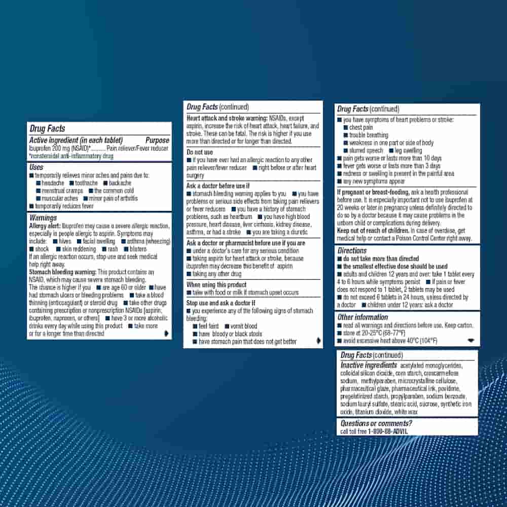 Advil Ibuprofen Tablets are formulated to provide effective relief from various types of pain, including headaches, muscle aches, backaches, menstrual cramps, toothaches, and minor arthritis pain. Each tablet contains 200 mg of ibuprofen, a nonsteroidal anti-inflammatory drug (NSAID) that works by reducing inflammation and alleviating pain. The tablets are coated for easy swallowing and are suitable for adults and children over 12 years of age. This package contains 100 tablets, making it convenient for long-term use. For optimal results, follow the dosing instructions on the label or as directed by a healthcare professional.