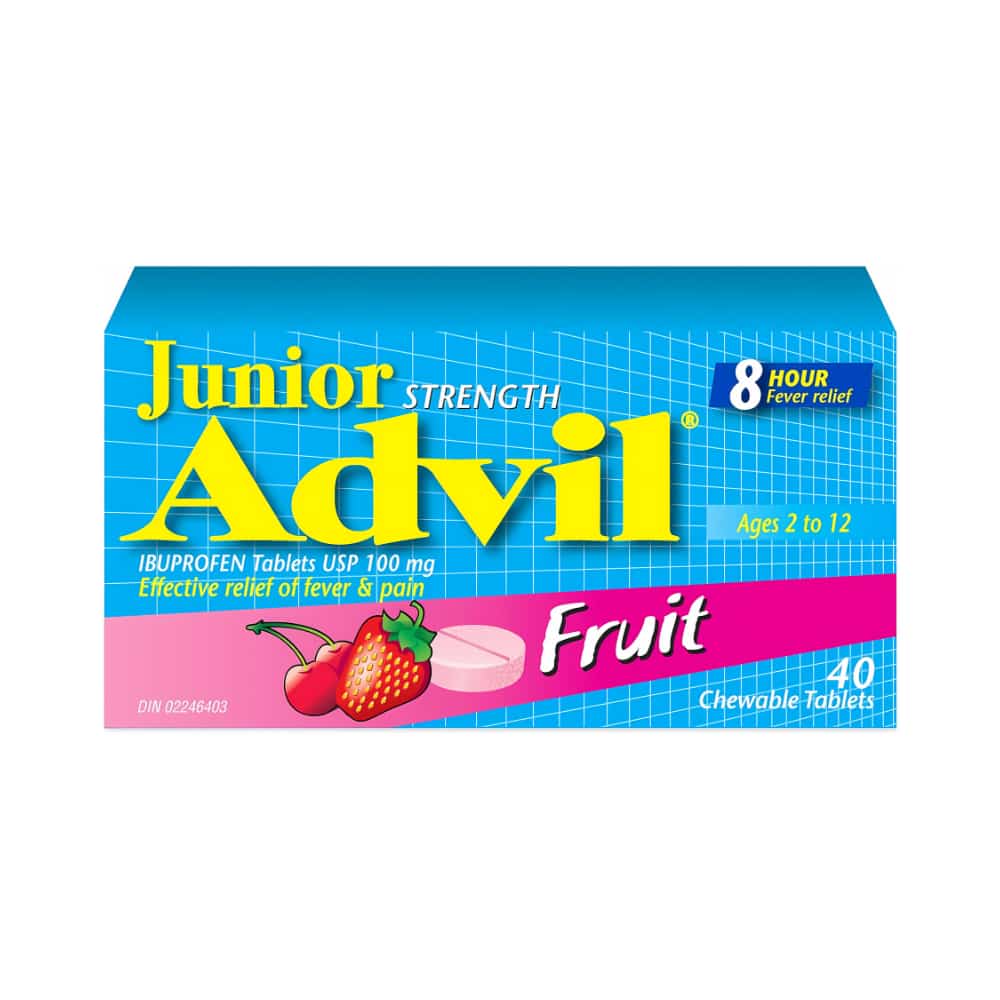 Advil Junior Strength Chewable Tablets are designed to provide effective relief from pain and fever in children aged 2 to 12 years. Each tablet contains 100 mg of ibuprofen, a nonsteroidal anti-inflammatory drug (NSAID) that works by reducing inflammation and alleviating pain. These chewable tablets are fruit-flavored, making them more palatable for children, and do not require water for ingestion. The product comes in a convenient 40-count bottle, suitable for multiple uses. For optimal results, follow the dosing instructions on the label or as directed by a healthcare professional.