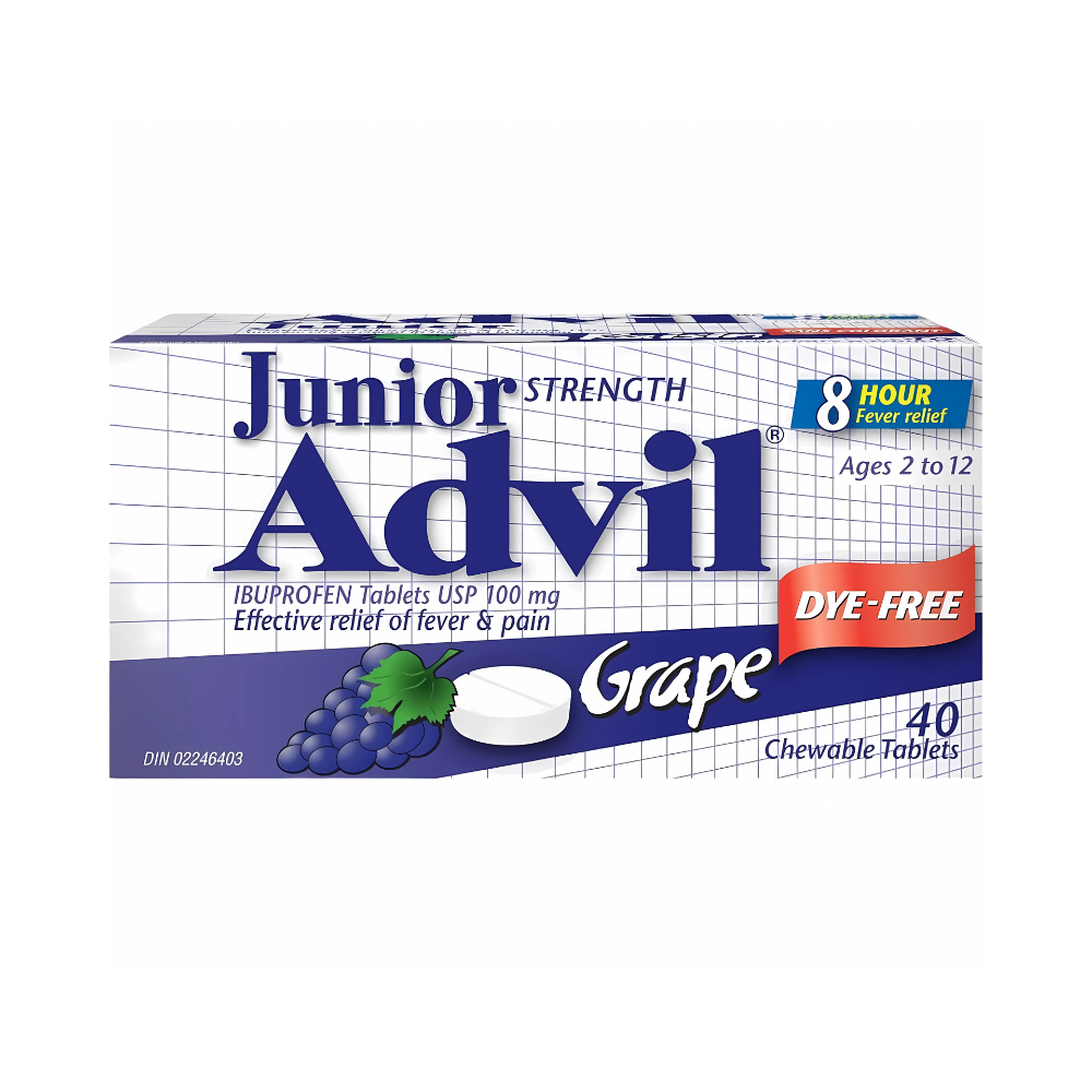 Advil Junior Strength Dye-Free Grape Chewable Tablets are formulated to provide effective relief from pain and fever in children aged 2 to 12 years. Each chewable tablet contains 100 mg of ibuprofen, a nonsteroidal anti-inflammatory drug (NSAID) that works by reducing inflammation and alleviating pain. These tablets are dye-free, making them suitable for children with sensitivities to artificial colors. They are designed for easy administration without the need for water, enhancing convenience for both parents and children. The pleasant grape flavor improves palatability, encouraging children to take their medication. The product comes in a 40-count bottle, suitable for multiple uses. For optimal results, follow the dosing instructions on the label or as directed by a healthcare professional.