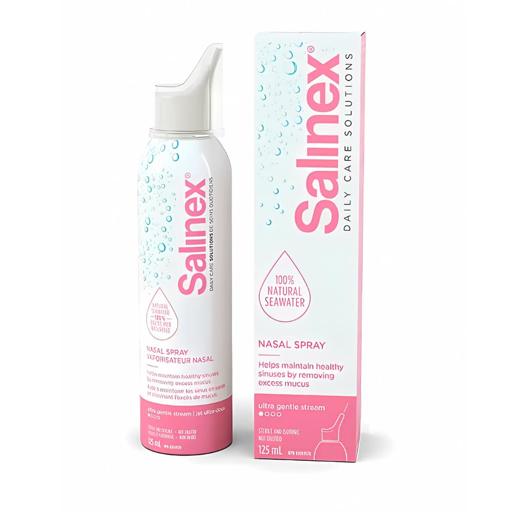 The Salinex Daily Nasal Spray Ultra Gentle is a nasal spray formulated with 100% natural seawater, designed to gently and effectively cleanse and moisturize the nasal passages. This product helps maintain sinus health by removing excess mucus, facilitating drainage, and relieving nasal congestion associated with colds and allergic rhinitis. Its isotonic solution, with a 0.9% sodium chloride concentration, is suitable for adults and children over 2 years old, including those with sensitive noses or first-time users. The spray contains no additives or preservatives, is non-habit forming, has no rebound effect, and is sterile. It is recommended to apply it twice daily for nasal health maintenance, and four to six times daily when cold or allergy symptoms are present. To use, tilt the head to one side, gently insert the nozzle into the nostril, and spray for two to three seconds, repeating the process in the other nostril. After use, the nozzle should be cleaned with warm water.