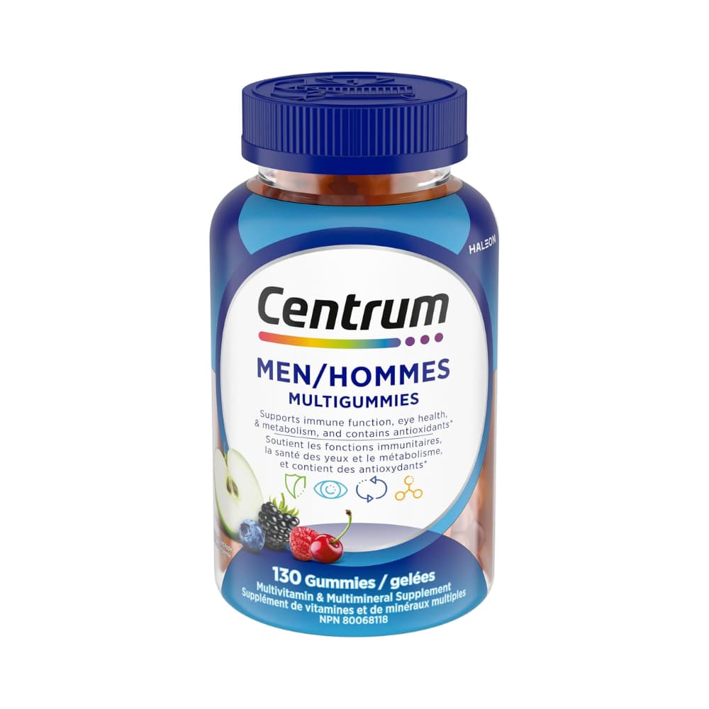 Boost your daily health with Centrum MultiGummies for men. These delicious gummies provide essential vitamins and minerals to support energy, immunity, and metabolism. Each serving offers a balanced mix of key nutrients, including Vitamins A, C, D, and E, in a convenient, easy-to-take gummy form. 130 gummies per bottle.