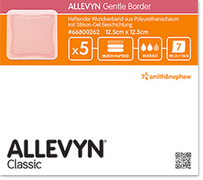 The Allevyn Classic RangeAllevyn AdhesiveWith a secure adhesive for when security is paramount and dressing retention is key.Allevyn Non-AdhesiveA versatile dressing range ideal for compromised skinAllevyn GentleWith a low tack, soft gel adhesive for gentle applicationAllevyn Gentle BorderA gentle silicone adhesive dressing available in a range of shapes and sizes for challenging areasAllevyn Gentle Border LiteA soft, light, flexible silicone adhesive dressing for lightly exuding woundsAllevyn AgAll the benefits of ALLEVYN with added silver for when an antimicrobial is required