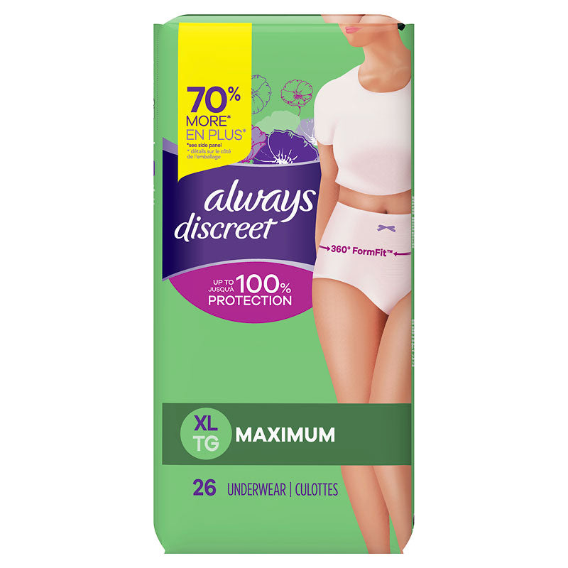 Stay confident and protected with Always Discreet Underwear Maximum absorbency in Extra Large size. Designed to provide up to 100% bladder leak protection, these underwear feature a soft, comfortable fit with a discreet, underwear-like design. The absorbent core quickly locks away moisture and odors, keeping you dry and fresh throughout the day.